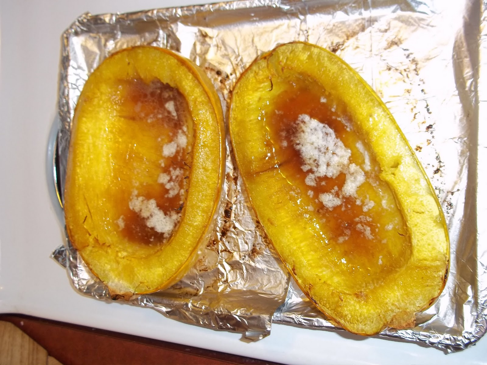 4.Flip the squash and put about half the butter and about half the brown sugar in each of the cavities of the squash halves.