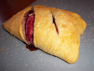 4Place about 1T Jelly down center of each dough rectangle. Spoon 1 rounded tablespoons cream cheese mixture onto the jelly spread slightly. Fold dough rectangle in half crosswise. Place on greased cookie sheet; press edges with fork to seal. Brush tops with milk; sprinkle with 1 tablespoons sugar. With sharp knife, cut 3 diagonal slits in top of each square.