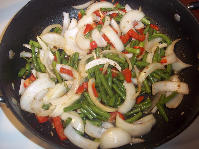 4.Return wok or skillet to high heat; add onion, garlic and black-bean sauce. Quickly stir in green beans and bell pepper. Add 1/4 cup water, cover, and cook 3 minutes or until vegetables are tender-crisp.